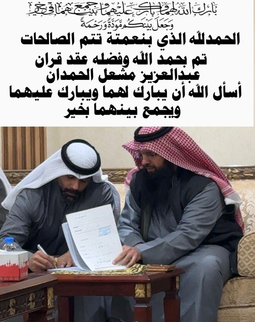 الحمدلله الذي تتم بنعمته الصالحاتتم بحمد الله عقد قران :( نصار خلف الرمضان المطيري )راجياً…
